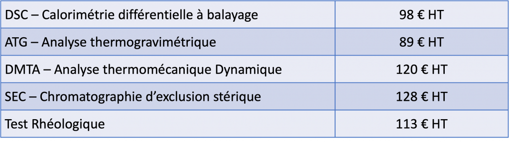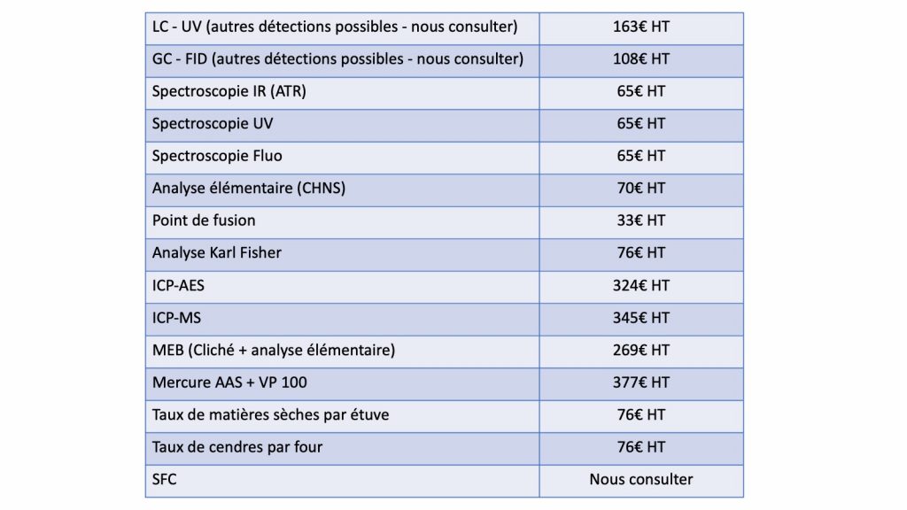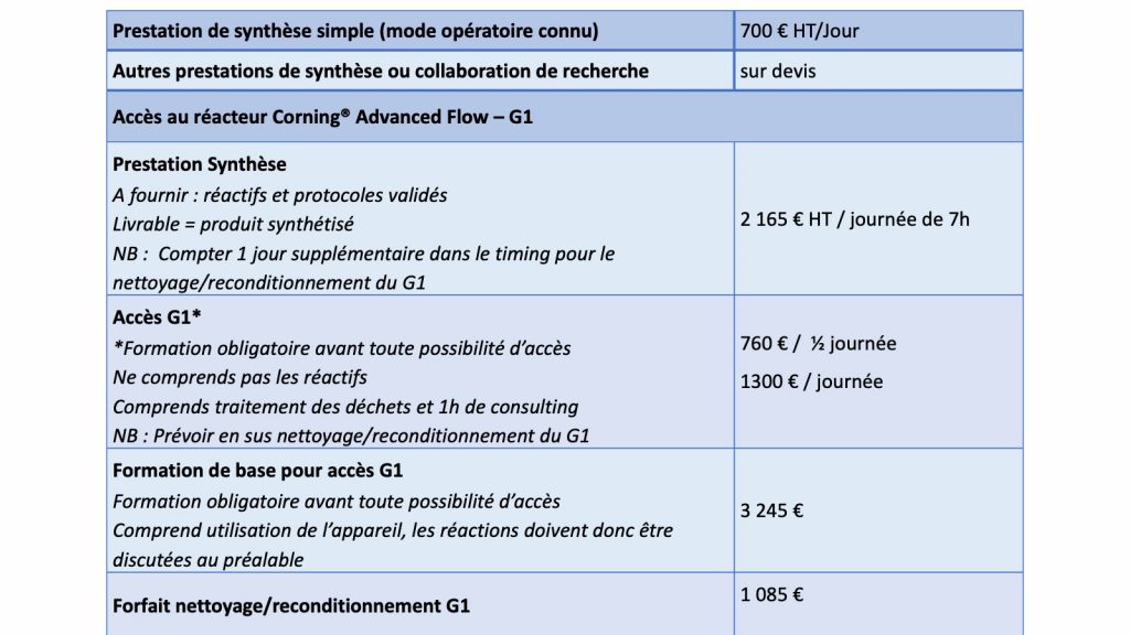Les solvants spécifiques et/ou l’azote liquide nécessaires lors de la mise en œuvre d’expériences particulières seront facturés en sus.